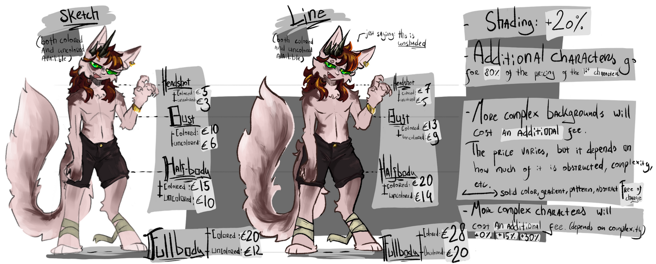 I always do references as a colored sketch, simply out of principle that is the only thing I feel comfortable offering. When ordering a reference you get minimum 2, maximum 4 angles (front +...). Their accessories, alternative outfits may be drawn separately, however that will cost extra!